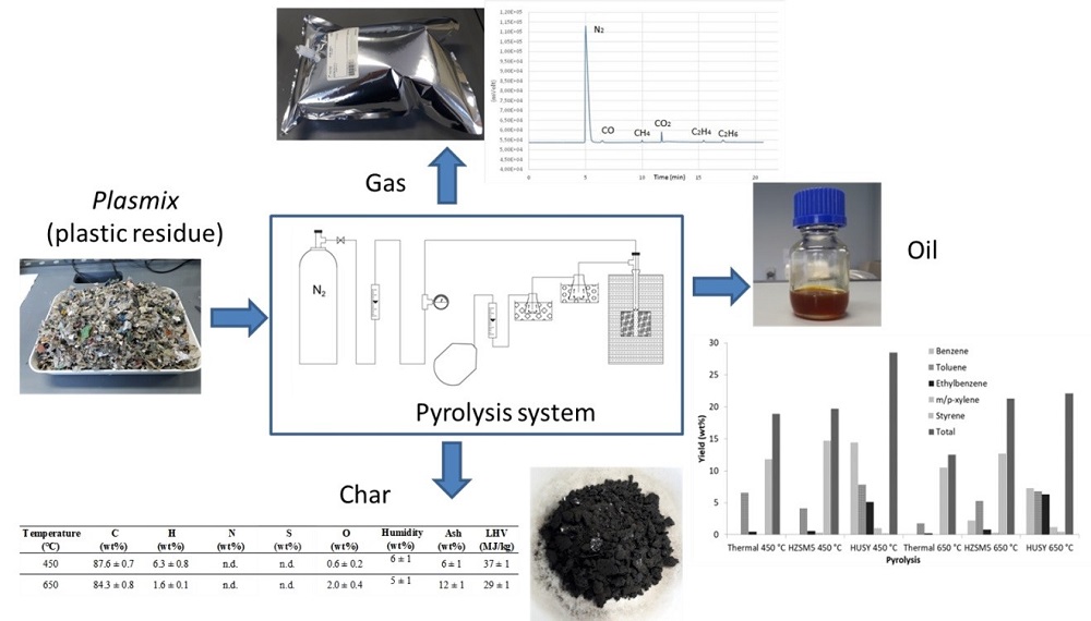 A synthetic mixture of real waste packaging plastics representative of the residue from a material recovery facility (plasmix) was submitted to thermal and catalytic pyrolysis. Preliminary thermogravimetry experiments coupled with Fourier transform infrared spectroscopy were performed to evaluate the effects of the catalysts on the polymers’ degradation temperatures and to determine the main compounds produced during pyrolysis. The thermal and catalytic experiments were conducted at 370°C, 450°C and 650°C using a bench scale reactor. The oil, gas, and char yields were analyzed and the compositions of the reaction products were compared. The primary aim of this study was to understand the effects of zeolitic hydrogen ultra stable zeolite Y (HUSY) and hydrogen zeolite socony mobil-5 (HZSM5) catalysts with high silica content on the pyrolysis process and the products’ quality. Thermogravimetry showed that HUSY significantly reduces the degradation temperature of all the polymers—particularly the polyolefines. HZSM5 had a significant effect on the degradation of polyethylene due to its smaller pore size. Mass balance showed that oil is always the main product of pyrolysis, regardless of the process conditions. However, all pyrolysis runs performed at 370°C were incomplete. The use of either zeolites resulted in a decrease in the heavy oil fraction and the prevention of wax formation. HUSY has the best performance in terms of the total monoaromatic yield (29 wt-% at 450°C), while HZSM5 promoted the production of gases (41 wt-% at 650°C). Plasmix is a potential input material for pyrolysis that is positively affected by the presence of the two tested zeolites. A more effective separation of polyethylene terephthalate during the selection process could lead to higher quality pyrolysis products.