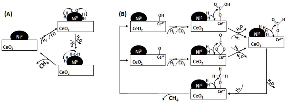 Nanosized NiO, CeO 2 and NiO-CeO 2 mixed oxides with different Ni/Ce molar ratios were prepared by the soft template method. All the samples were characterized by different techniques as to their chemical composition, structure, morphology and texture. On the catalysts submitted to the same reduction pretreatment adopted for the activity tests the surface basic properties and specific metal surface area were also determined. NiO and CeO 2 nanocrystals of about 4 nm in size were obtained, regardless of the Ni/Ce molar ratio. The Raman and X-ray photoelectron spectroscopy results proved the formation of defective sites at the NiO-CeO 2 interface, where Ni species are in strong interaction with the support. The microcalorimetric and Fourier transform infrared analyses of the reduced samples highlighted that, unlike metallic nickel, CeO 2 is able to effectively adsorb CO 2, forming carbonates and hydrogen carbonates. After reduction in H 2 at 400 °C for 1 h, the catalytic performance was studied in the CO and CO 2 co-methanation reaction. Catalytic tests were performed at atmospheric pressure and 300 °C, using CO/CO 2/H 2 molar compositions of 1/1/7 or 1/1/5, and space velocities equal to 72000 or 450000 cm 3∙h –1∙g cat –1. Whereas CO was almost completely hydrogenated in any investigated experimental conditions, CO 2 conversion was strongly affected by both the CO/CO 2/H 2 ratio and the space velocity. The faster and definitely preferred CO hydrogenation was explained in the light of the different mechanisms of CO and CO 2 methanation. On a selected sample, the influence of the reaction temperature and of a higher number of space velocity values, as well as the stability, were also studied. Provided that the Ni content is optimized, the NiCe system investigated was very promising, being highly active for the CO x co-methanation reaction in a wide range of operating conditions and stable (up to 50 h) also when submitted to thermal stress.