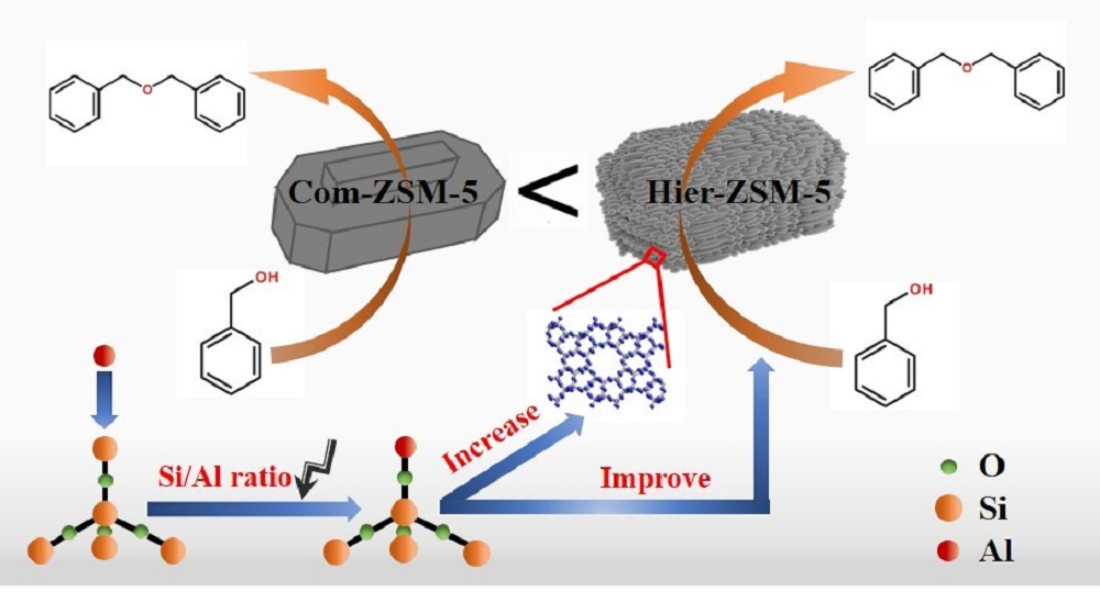 Hierarchical single-crystal ZSM-5 zeolites with different Si/Al ratios (Hier-ZSM-5- x, where x = 50, 100, 150 and 200) were synthesized using an ordered mesoporous carbon-silica composite as hard template. Hier-ZSM-5- x exhibits improved mass transport properties, excellent mechanical and hydrothermal stability, and higher catalytic activity than commercial bulk zeolites in the benzyl alcohol self-etherification reaction. Results show that a decrease in the Si/Al ratio in hierarchical single-crystal ZSM-5 zeolites leads to a significant increase in the acidity and the density of micropores, which increases the final catalytic conversion. The effect of porous hierarchy on the diffusion of active sites and the final catalytic activity was also studied by comparing the catalytic conversion after selectively designed poisoned acid sites. These poisoned Hier-ZSM-5- x shows much higher catalytic conversion than the poisoned commercial ZSM-5 zeolite, which indicates that the numerous intracrystalline mesopores significantly reduce the diffusion path of the reactant, leading to the faster diffusion inside the zeolite to contact with the acid sites in the micropores predominating in ZSM-5 zeolites. This study can be extended to develop a series of hierarchical single-crystal zeolites with expected catalytic performance.
