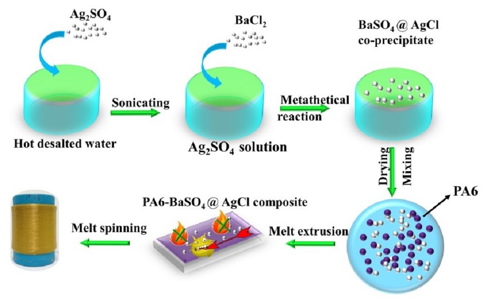 In this study, a facile and environmentally friendly method with low energy consumption for preparing nanoscale AgCl and BaSO4 co-precipitates (AgCl@BaSO4 co-precipitates) was developed based on the metathetical reaction. Then, the dried co-precipitates were melt-compounded with polyamide 6 (PA6) resins at a specified mass ratio in a twin-screw extruder. The results demonstrated that in the absence of any coating agent or carrier, the nanoparticles of AgCl@BaSO4 co-precipitates were homogeneously dispersed in the PA6 matrix. Further analysis showed that after the addition of AgCl@BaSO4 co-precipitates, the antibacterial performance, along with the flame-retardance and anti-dripping characteristics of PA6, was enhanced significantly. In addition, the PA6 composites possessed high spinnability in producing pre-oriented yarn.