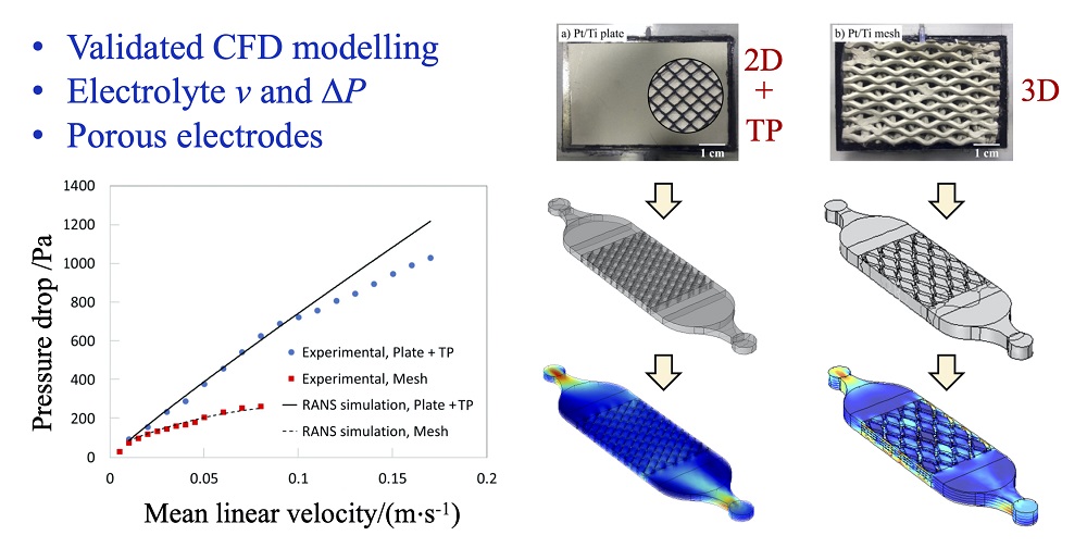 Description of electrolyte fluid dynamics in the electrode compartments by mathematical models can be a powerful tool in the development of redox flow batteries (RFBs) and other electrochemical reactors. In order to determine their predictive capability, turbulent Reynolds-averaged Navier-Stokes (RANS) and free flow plus porous media (Brinkman) models were applied to compute local fluid velocities taking place in a rectangular channel electrochemical flow cell used as the positive half-cell of a cerium-based RFB for laboratory studies. Two different platinized titanium electrodes were considered, a plate plus a turbulence promoter and an expanded metal mesh. Calculated pressure drop was validated against experimental data obtained with typical cerium electrolytes. It was found that the pressure drop values were better described by the RANS approach, whereas the validity of Brinkman equations was strongly dependent on porosity and permeability values of the porous media.