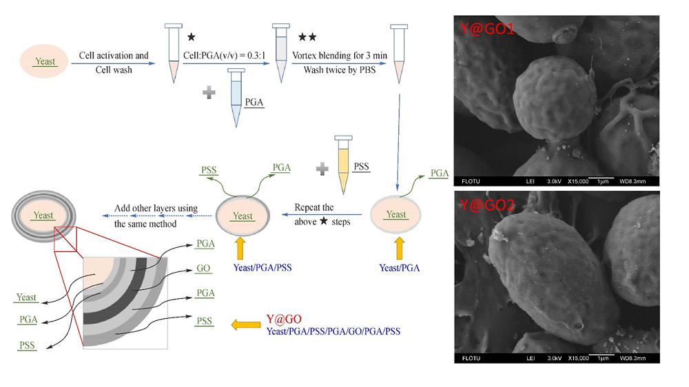 Graphene oxide (GO) has been increasingly utilized in the fields of food, biomedicine, environment and other fields because of its benign biocompatible. We encapsulated two kinds of GO with different sizes on yeast cells with the assistance of polyelectrolytes poly (styrene sulfonic acid) sodium salt (PSS) and polyglutamic acid (PGA) (termed as Y@GO). The result does not show a significant difference between the properties of the two types of Y@GO (namely Y@GO1 and Y@GO2). The encapsulation layers are optimized as Yeast/PGA/PSS/PGA/GO/PGA/PSS based on the morphology, dispersity, colony-forming unit, and zeta potential. The encapsulation of GO increases the roughness of the yeast. It is proved that the Y@GO increases the survival time and enhance the activity of yeast cells. The GO shell improves the resistance of yeast cells against pH and salt stresses and extends the storage time of yeast cells.