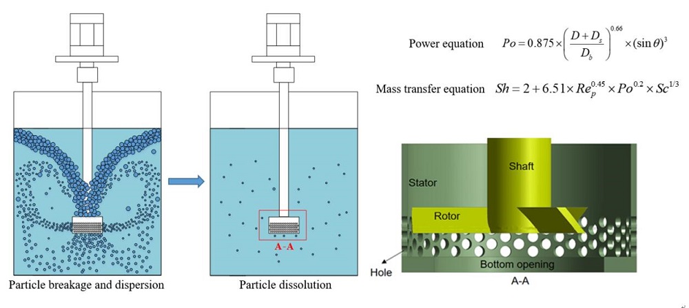 The jet-flow high shear mixer (JF-HSM) is a new type of intensified equipment with special configurations of the rotor and the stator. The mass transfer property and power consumption were studied in the solid-liquid system for a series of JF-HSMs involving different configuration parameters, such as rotor diameter, rotor blade inclination, rotor blade bending direction, stator diameter, and stator bottom opening diameter. The flow characteristics were examined by computational fluid dynamic simulations. Results indicate that the turbulent power consumption of the JF-HSM is affected by the change in rotor blade inclination and stator bottom opening. With the increase in the shear head size and the change in the rotor into a backward-curved blade, the solid-liquid mass transfer rate can be remarkably increased under the same input power. Dimensionless correlations for the mass transfer coefficient and power consumption were obtained to guide the scale-up design and selection of such a new type of equipment to intensify the overall mixing efficiency.