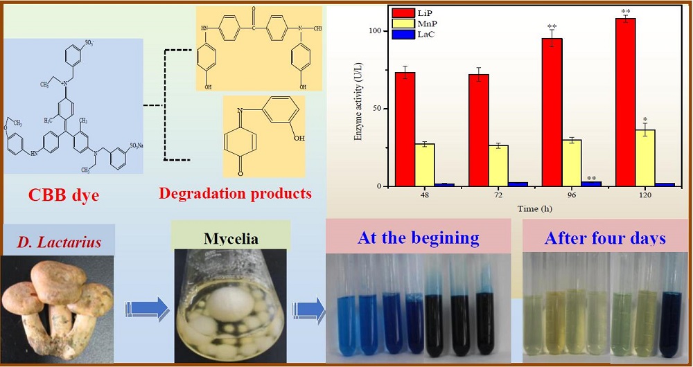 Fungi play an important role in dying wastewater treatment. In this work, the mycelia of Lactarius deliciosus exhibited an excellent capacity in decolorizing coomassie brilliant blue (CBB). The results demonstrated that the mycelia could treat CBB with high concentrations over a broad range of pH and temperature. The decolorization rate of 99.19% and the removal rate of 16.31 mg·L‒1·h were realized. The mycelia could be recycled from decolorizing process for 19 times, indicating a good re-usability. It verified that the lignin peroxidase (121.65 U·L‒1) and manganese peroxidase (36.77 U·L‒1) were involved in the degradation and decolorization process of CBB. Toxicity assessments indicated the seed germination rate was up to 82.22% while inhibition to Escherichia coli decreased dramatically and no significant effect on Caenorhabditis elegans growth was found. The removal of CBB was a synergistic process accomplished by adsorption and biodegradation. The mycelia could be used for eco-friendly CBB treatment.