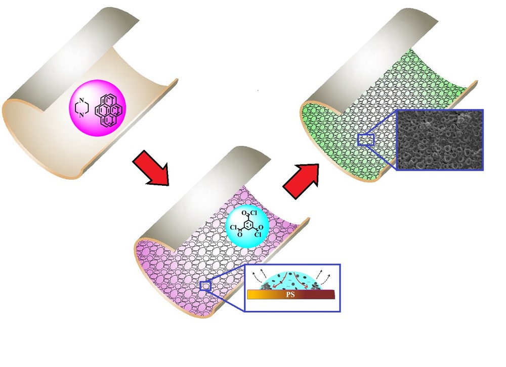 Polyamide (PA) hollow fibre composite nanofiltration (NF) membranes with a coffee-ring structure and beneficial properties were prepared by adding graphene oxide (GO) into the interfacial polymerization process. The presentation of the coffee-ring structure was attributed to the heterogeneous, finely dispersed multiphase reaction system and the “coffee-stain” effect of the GO solution. When the piperazine concentration was 0.4 wt-%, the trimesoyl chloride concentration was 0.3 wt-%, and the GO concentration was 0.025 wt-%, the prepared NF membranes showed the best separation properties. The permeate flux was 76 L·m−2·h−1, and the rejection rate for MgSO4 was 98.6% at 0.4 MPa. Scanning electron microscopy, atomic force microscopy, and attenuated total reflectance-Fourier transform infrared spectroscopy were used to characterize the chemical structure and morphology of the PA/GO NF membrane. The results showed that GO was successfully entrapped into the PA functional layer. Under neutral operating conditions, the PA/GO membrane showed typical negatively charged NF membrane separation characteristics, and the rejection rate decreased in the order of Na2SO4>MgSO4>MgCl2>NaCl. The PA/GO NF membrane showed better antifouling performance than the PA membrane.