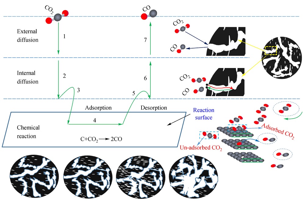 Mass transfer usually affects the rate of chemical reactions in coal. The effect of internal diffusion on char gasification with CO2 in the temperature range from 1123 K to 1273 K was investigated via thermo-gravimetric analysis and assessment of char morphology features. The results revealed that the effect of internal diffusion on the initial reaction rate was more significant with an increase of particle size, due to the concentration gradient of the gasification agent within the solid particles. In the early stage of gasification, the generation of new micropores and the opening of closed pores led to an increase in specific surface area. As the reaction proceeded, the openings were gradually expanded and the specific surface area continued to increase. However, with further reaction, disappearance of edge pores, melting and collapse of the pore structure led to a decrease in specific surface area. The intrinsic activation energy and reaction order based on the nth-order model were 157.67 kJ∙mol−1 and 0.36, respectively. Thus, temperature zones corresponding to chemical reaction and diffusion control were identified. Moreover, the calculated effectiveness factor provided a quantitative estimation of internal diffusion in the initial stage.