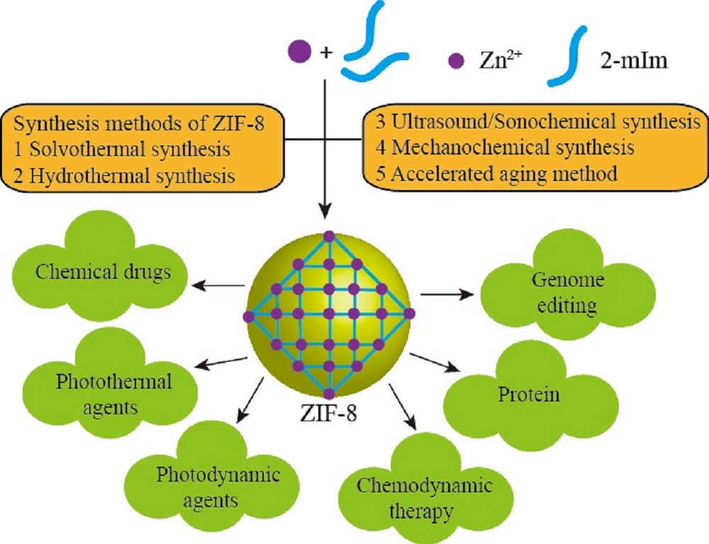 Zeolitic imidazolate framework-8 (ZIF-8), composed of Zn ions and imidazolate ligands, is a class of metal-organic frameworks, which possesses a similar structure as conventional aluminosilicate zeolites. This material exhibits inherent porous property, high loading capacity, and pH-sensitive degradation, as well as exceptional thermal and chemical stability. Extensive research effort has been devoted to relevant research aspects ranging from synthesis methods, property characterization to potential applications of ZIF-8. This review focuses on the recent development of ZIF-8 synthesis methods and its promising applications in drug delivery. The potential risks of using ZIF-8 for drug delivery are also summarized.