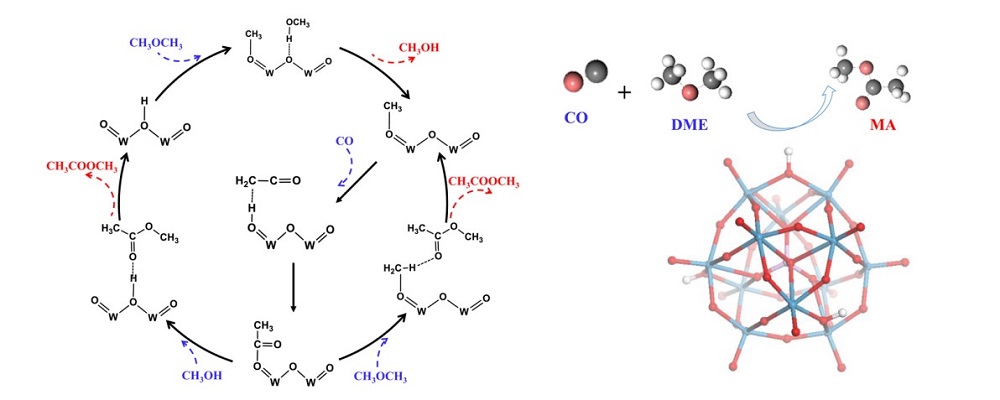 Dimethyl ether (DME) carbonylation is considered as a key step for a promising route to produce ethanol from syngas. Heteropolyacids (HPAs) are proved to be efficient catalysts for DME carbonylation. In this work, the reaction mechanism of DME carbonylation was studied theoretically by using density functional theory calculations on two typical HPA models (HPW, HSiW). The whole process consists of three stages: DME dissociative adsorption, insertion of CO into methoxyl group and formation of product methyl acetate. The activation barriers of all possible elementary steps, especially two possible paths for CO insertion were calculated to obtain the most favorable reaction mechanism and rate-limiting step. Furthermore, the effect of the acid strength of Brønsted acid sites on reactivity was studied by comparing the activation barriers over HPW and HSiW with different acid strength, which was determined by calculating the deprotonation energy, Mulliken population analyses and adsorption energies of pyridine.