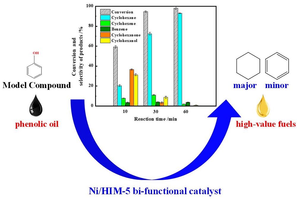A series of Ni/HZSM-5 and Ni/HIM-5 bi-functional catalysts were synthesized and applied to the aqueous-phase hydrodeoxygenation (HDO) of phenol. The Ni dispersibility and particle sizes were shown to be directly related to the porosity and crystal sizes of the parent zeolites, which further influenced the catalytic performances. The large pores and small crystal sizes of the parent zeolites were beneficial for dispersing Ni and forming small Ni particles, and the corresponding Ni/zeolite catalyst exhibited a higher phenol conversion and selectivity towards hydrocarbons. Importantly, the Ni/HIM-5 bi-functional catalyst exhibited a high activity (98.3%) and high selectivity for hydrocarbons (98.8%) when heated at 220°C for 1 h and is thus a new potential catalyst for the HDO of phenolics to form hydrocarbons in the aqueous phase.
