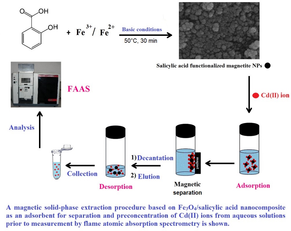In this research, an eco-friendly magnetic adsorbent based on Fe3O4/salicylic acid nanocomposite was fabricated using a facile one-pot co-precipitation method. The crystalline and morphological characterization of the prepared nanocomposite was performed by field emission scanning electron microscopy, X-ray diffraction, and Fourier transform infrared spectroscopy. The nanocomposite was employed as a magnetic solid-phase extraction agent for separation of Cd(II) ions from synthetic solutions. Some experimental factors affecting the extraction efficiency were investigated and optimized. Following elution with acetic acid (pH 3.5), the pre-concentrated analyte was quantified by flame atomic absorption spectrometry. In optimal conditions, a linear calibration graph was achieved in the concentration range of 0.2–30 ng·mL−1 with a determination coefficient (R2) of 0.9953. The detection limit, the enhancement factor, inter- and intra-day relative standard deviations (for six consecutive extractions at the concentration level of 10 ng·mL−1) were 0.04 ng·mL−1, 100, 2.38% and 1.52%, respectively. To evaluate the accuracy of the method, a certified reference material (NIST SRM 1643e) was analyzed, and there was a good agreement between the certified and the measured values. It was successfully utilized to determine cadmium in industrial wastewater samples and the attained relative recovery values were between 96.8% and 103.2%.