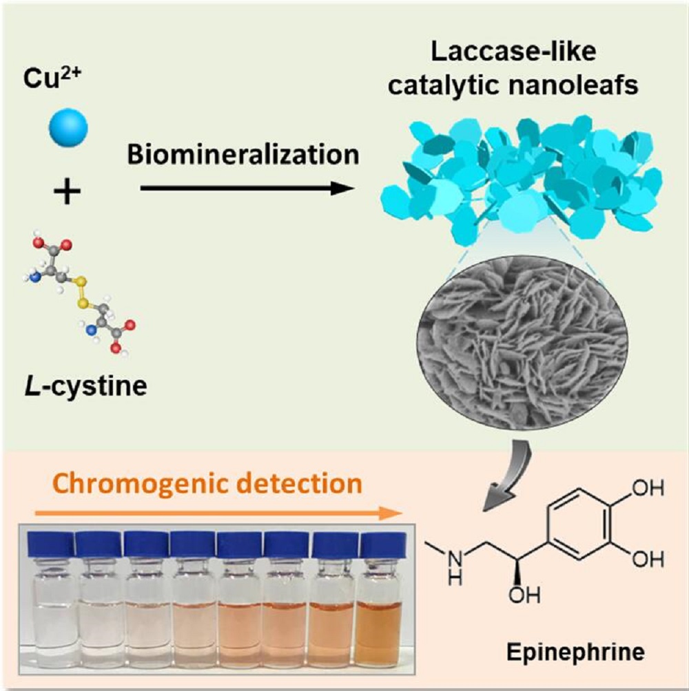 Recently, many efforts have been dedicated to creating enzyme-mimicking catalysts to replace natural enzymes in practical fields. Inspired by the pathological biomineralization behaviour of L-cystine, in this study, we constructed a laccase-like catalyst through the co-assembly of L-cystine with Cu ions. Structural analysis revealed that the formed catalytic Cu-cystine nanoleaves (Cu-Cys NLs) possess a Cu(I)-Cu(II) electron transfer system similar to that in natural laccase. Reaction kinetic studies demonstrated that the catalyst follows the typical Michaelis-Menten model. Compared with natural laccase, the Cu-Cys NLs exhibit superior stability during long-term incubation under extreme pH, high-temperature or high-salt conditions. Remarkably, the Cu-Cys NLs could be easily recovered and still maintained 76% of their activity after 8 cycles. Finally, this laccase mimic was employed to develop a colorimetric method for epinephrine detection, which achieved a wider linear range (9–455 μmol·L−1) and lower limit of detection (2.7 μmol·L−1). The Cu-Cys NLs also displayed excellent specificity and sensitivity towards epinephrine in a test based on urine samples.