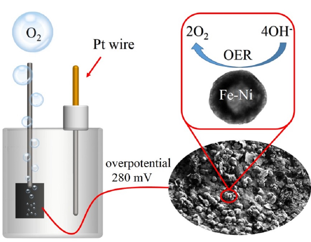 Polymer-derived porous carbon was used as a support of iron and nickel species with an objective to obtain an efficient oxygen reduction reaction (OER) catalyst. The surface features were extensively characterized using X-ray diffraction, X-ray photoelectron spectroscopy and high-resolution transmission electron microscopy. On FeNi-modified carbon the overpotential for OER was very low (280 mV) and comparable to that on noble metal catalyst IrO2. The electrochemical properties have been investigated to reveal the difference between the binary alloy- and single metal-doped carbons. This work demonstrates a significant step for the development of low-cost, environmentally-friendly and highly-efficient OER catalysts.