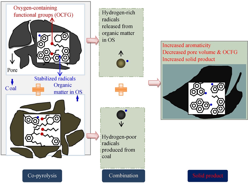 A mixture of Pingdingshan lean coal and acid-treated Huadian oil shale was co-pyrolyzed in a drop-tube fixed-bed reactor in the temperature range of 300 °C–450 °C. To reveal the formation mechanism of the solid co-pyrolysis product, changes in some physicochemical properties were investigated, using analysis by X-ray diffraction, X-ray photoelectron spectroscopy, scanning electron microscopy, pore analysis, thermogravimetry, and electron spin resonance. X-ray diffraction showed that the lattice plane spacing for the co-pyrolyzed mixture decreased from 0.357 nm to 0.346 nm and the average stacking height increased from 1.509 nm to 1.980 nm in the temperature range of 300 °C–450 °C, suggesting that pyrolysis treatment increased its degree of metamorphism. The amount of oxygen-containing functional groups and pore volume decreased with increasing temperature. Thermogravimetry and electron spin resonance results showed that synergistic effects occurred during the co-pyrolysis process. A formation mechanism for the solid product was proposed. Hydrogen-rich radicals generated from the pyrolysis of the oil shale were trapped by hydrogen-poor macromolecular radicals of the intermediate metaplast produced from coal pyrolysis, thereby increasing the yield of solid product.