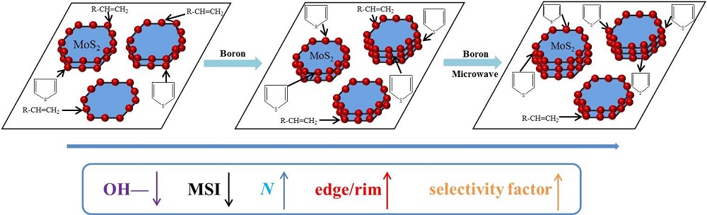 Catalytic hydrodesulfurization (HDS) technique is widely used for clean gasoline production. However, traditional HDS catalyst (CoMo/γ-Al2O3) exhibits high hydrogenation performance of olefins (HYDO), resulting in the loss of gasoline octane number. To achieve high HDS/HYDO ratio, the key issue is to reduce the interaction between active metals and the support, therefore, in this research, the modified CoMo/γ-Al2O3 catalysts with various boron amounts were investigated under traditional or microwave heating. The effects of preparing methods as well as boron amounts on the active phase, acidic properties and HDS catalytic activities were examined. Results show that the modification, especially under microwave treatment, can significantly weaken the interaction between the active component and the support by enlarging the surface area and pore diameter, and reducing the acidity of the support. As a result, the stacking numbers of MoS2 slabs were obviously improved by the modification and microwave treatment, contributing to higher edge/rim ratio, and resulting in higher HDS performance and selectivity to olefin.
