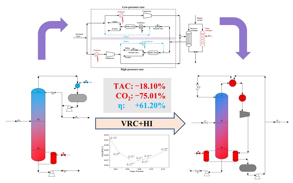 In this study, vapor recompression and heat integration assisted distillation arrangements with either the low or high pressure in the reflux drum are proposed to reduce and/or eliminate the application of the costly refrigerant for the separation of n-heptane and isobutanol mixture. The high-pressure arrangement with vapor recompression and heat integration is the most attractive among these four intensified configurations since it can reduce total annual cost by 18.10%, CO2 emissions by 75.01% based on natural gas (78.78% based on heavy oil fuel), and second-law efficiency by 61.20% compared to a conventional refrigerated distillation system. Furthermore, exergy destruction in each component is calculated for the heat integration configurations and is shown in pie diagrams. The results demonstrate that the high-pressure configuration presents unique advantages in terms of thermodynamic efficiency compared to the low-pressure case. In addition, dynamic control investigation is performed for the economically efficient arrangement and good product compositions are well controlled through a dual-point temperature control strategy with almost negligible product offsets and quick process responses when addressing 20% step changes in production rate and feed composition. Note that there are no composition measurement loops in our developed control schemes.