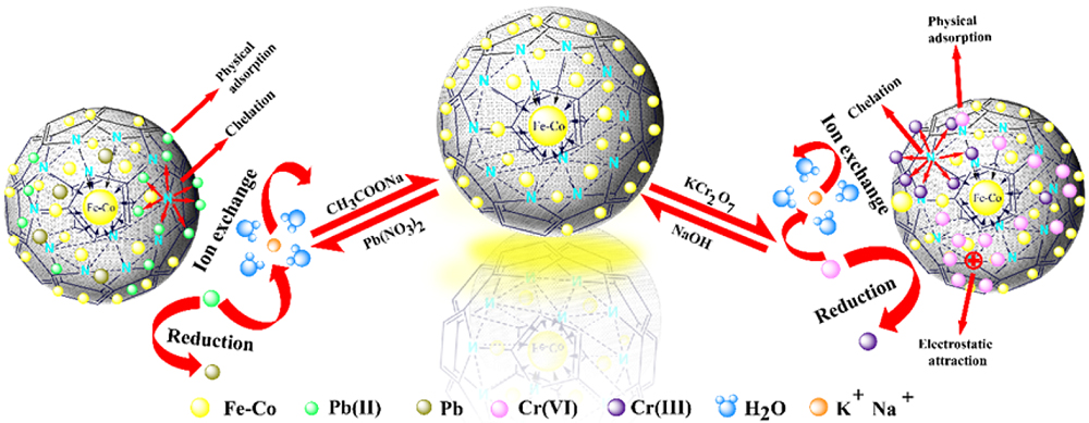 The magnetic nitrogen-doped carbon (MNC) was prepared from polypyrrole by a simple high temperature calcination process in this paper. The structure and properties of MNC were analyzed by scanning electron microscope, Fourier transform infrared spectroscopy, X-ray diffraction, Brunner-Emmet-Teller, vibrating sample magnetometer, and X-ray photoelectron spectroscopy. The capacity of MNC to adsorb Cr(VI) and Pb(II) was evaluated. The effects of the initial pH, dosage, concentration and temperature on the adsorption capacity of MNC were measured. MNC had a large specific surface area and a special porous structure. Its nitrogen and carbon sources were rich, and the ratio of carbon to nitrogen was fixed. The maximum Cr(VI)-adsorption capacity and maximum Pb(II) adsorption capacity of MNC could reach 456.63 and 507.13 mg∙g−1 at 318 K, respectively. The pseudo-second-order model was used to describe the adsorption kinetics of MNC, and the Freundlich model was employed to discuss its isotherms. The adsorption process was affected by the electrostatic force, the reducing reaction, pores and chelation. The results of this study suggest that MNC is a material with superior performance, and is very easily regenerated, reused, and separated in the adsorption process.