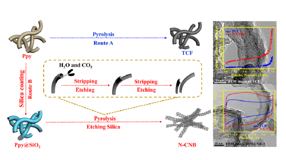 In this present work, N-doped carbon nanobelts (N-CNBs) were prepared by a confined-pyrolysis approach and the N-CNBs were derived from a polypyrrole (Ppy) tube coated with a compact silica layer. The silica layer provided a confined space for the Ppy pyrolysis, thereby hindering the rapid overflow of pyrolysis gas, which is the activator for the formation of carbonaceous materials. At the same time, the confined environment can activate the carbon shell to create a thin wall and strip the carbon tube into belt morphology. This process of confined pyrolysis realizes self-activation during the pyrolysis of Ppy to obtain the carbon nanobelts without adding any additional activator, which reduces pollution and preparation cost. In addition, this approach is simple to operate and avoids the disadvantages of other methods that consume time and materials. The as-prepared N-CNB shows cross-linked nanobelt morphology and a rich porous structure with a large specific surface area. As supercapacitor electrode materials, the N-CNB can present abundant active sites, and exhibits a specific capacitance of 246 F·g−1, and excellent ability with 95.44% retention after 10000 cycles. This indicates that the N-CNB is an ideal candidate as a supercapacitor electrode material.