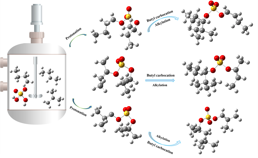 Octanes in alkylation products obtained from industrial alkylation were studied by batch experiments. More than eight octane isomers were identified and quantified by gas chromatography-mass spectrometry. Based on a classic carbenium ion mechanism, the carbocation transition states in concentrated sulfuric acid catalyzed alkylation were investigated using quantum-chemical simulations and predicted the concentration and octane isomerization products including trimethylpentane and dimethylhexane as well as the formation of heavier compounds that resulted from the oligomerization of octane and butene. The agreement between model calculations and experimental data was quite satisfactory. Calculation results indicated that composition and content of trimethylpentanes in the alkylation products were 2,2,4-trimethylpentane>2,3,3-trimethylpentane>2,3,4-trimethylpentane>2,2,3-trimethylpentane whether the 2-butene or i-butene acts as olefin. Heavier compounds in the alkylate were primarily formed by the oligomerization of dimethylhexane with 1-butene. Hopefully, the carbocation transition state models developed in this work will be useful for understanding the product distributions of octane in alkylation products.
