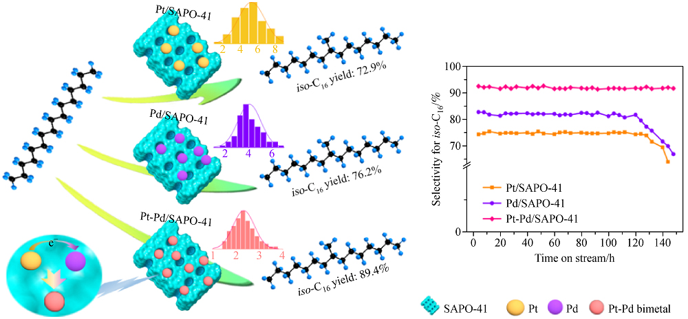 The hydroisomerization of n-hexadecane over Pt-Pd bimetallic catalysts is an effective way to produce clean fuel oil. This work reports a useful preparation method of bimetallic bifunctional catalysts by a co-impregnation or sequential impregnation process. Furthermore, monometallic catalysts with loading either Pt or Pd are also prepared for comparison. The effects of the metal species and impregnation order on the characteristics and catalytic performance of the catalysts are investigated. The catalytic test results indicate that the maximum iso-hexadecane yield over different catalysts increases as follows: Pt/silicoaluminophosphate SAPO-41<Pd/SAPO-41<Pt*-Pd/SAPO-41 (prepared by sequential impregnation)<Pt-Pd/SAPO-41 (prepared by co-impregnation). Owing to the synergic effects between Pt and Pd, the Pt-Pd/SAPO-41 catalyst prepared by the co-impregnation method demonstrates the effective promotion of (de)hydrogenation activity. Therefore, this catalyst exhibits the highest iso-hexadecane yield of 89.4% when the n-hexadecane conversion is 96.3%. Additionally, the Pt-Pd/SAPO-41 catalyst also presents the highest catalytic activity and best stability even after 150 h long-term tests.