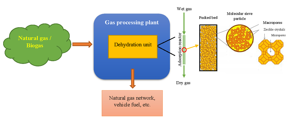 Natural gas and biogas are two mixtures that consist of methane as their main component. These two gas mixtures are usually saturated with water vapor, which cause many problems, such as damaging the gas processing equipment by increasing the gas’s corrosion potential or clogging the pipelines due to gas hydrate formation. Thus, removing water vapor from these gas streams is mandatory. In this review paper, the main dehydration methods have been overviewed, and scrutiny of the adsorption dehydration has been carried out. Furthermore, the most important solid desiccants and their improvements have been reviewed.