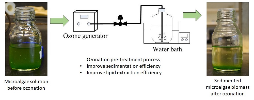 In the present study, ozone was introduced as an alternative approach to harvest and disrupt microalgae cells (Chlorella vulgaris) simultaneously for biodiesel production. At the optimum ozonation conditions (6.14 g·h–1 ozone concentration, 30 min ozonation time, 1 L·min–1 of ozone flowrate at medium pH of 10 and temperature of 30 °C), the sedimentation efficiency of microalgae cells increased significantly from 12.56% to 68.62%. It was observed that the microalgae cells aggregated to form flocs after pre-treated with ozone due to the increment of surface charge from –20 to –6.59 mV. Besides, ozone had successfully disrupted the microalgae cells and resulted in efficient lipid extraction, which was 1.9 times higher than the control sample. The extracted microalgae lipid was mainly consisted of methyl palmitate (C16:0), methyl oleate (C18:1) and methyl linolenate (C18:3), making it suitable for biodiesel production. Finally, utilization of recycled culture media after ozonation pre-treatment showed robust growth of microalgae, in which the biomass yield was maintained in the range of 0.796 to 0.879 g·h–1 for 5 cycles of cultivation.