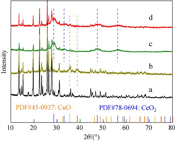 Heterogeneous halide-free carbonylation of methanol to acetates, including methyl acetate (MA) and acetic acid, using non-precious metal catalysts has been a topic of interest for decades. The key issue is that the water produced by methanol dehydration inhibits the formation of acetyl species and reduces the MA selectivity. Here, we report that CuCeOx/H-mordenite (H-MOR) catalyst can nearly eliminate the inhibiting effect of water on carbonylation by a water-gas shift reaction (WGSR) on-site, and can thus achieve 96.5% methanol conversion with 87.4% MA selectivity for the halide-free carbonylation of methanol. The results of powder X-ray diffraction, transmission electron microscopy, and scanning electron microscopy show that the Cu and Ce species are highly dispersed on H-MOR even when the CuCeOx contents are as high as 29 wt-%. Fourier transform infrared spectroscopy and CO chemisorption analysis reveal that a small portion of Cu species can migrate into the channel of H-MOR when CuCeOx/H-MOR is calcined at 500 °C and these Cu species are converted into Cu+ sites upon reduction. The Cu+ sites facilitate the WGSR and are also active sites for methanol carbonylation. The introduction of Ce benefits the inhibition of coke deposits and thus enhances the catalyst stability.