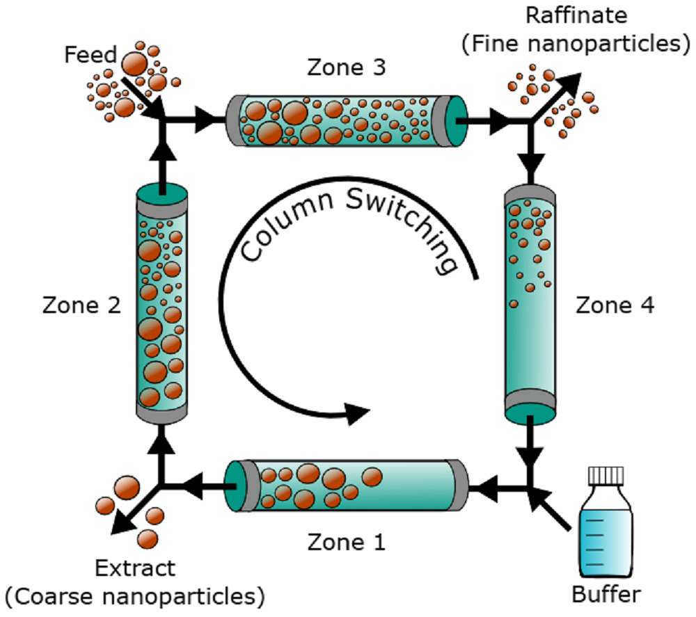 The size fractionation of magnetic nanoparticles is a technical problem, which until today can only be solved with great effort. Nevertheless, there is an important demand for nanoparticles with sharp size distributions, for example for medical technology or sensor technology. Using magnetic chromatography, we show a promising method for fractionation of magnetic nanoparticles with respect to their size and/or magnetic properties. This was achieved by passing magnetic nanoparticles through a packed bed of fine steel spheres with which they interact magnetically because single domain ferro-/ferrimagnetic nanoparticles show a spontaneous magnetization. Since the strength of this interaction is related to particle size, the principle is suitable for size fractionation. This concept was transferred into a continuous process in this work using a so-called simulated moving bed chromatography. Applying a suspension of magnetic nanoparticles within a size range from 20 to 120 nm, the process showed a separation sharpness of up to 0.52 with recovery rates of 100%. The continuous feed stream of magnetic nanoparticles could be fractionated with a space-time-yield of up to 5 mg/(L∙min). Due to the easy scalability of continuous chromatography, the process is a promising approach for the efficient fractionation of industrially relevant amounts of magnetic nanoparticles.