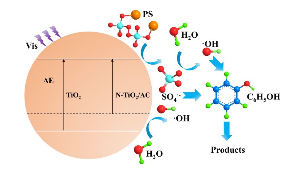 To realize the utilization of visible light and improve the photocatalytic efficiency of organic pollutant degradation in wastewater, a nitrogen-doped titanium-carbon composite (N-TiO2/AC) prepared by sol-gel methods was applied in the photodegradation of phenol assisted by persulfate under visible light irradiation (named N-TiO2/AC/PS/VIS). The results show that a synergistic effect exists between visible-light photocatalysis and persulfate activation. Compared with TiO2/PS/VIS, the phenol degradation rate was found to be observably improved by 65% in the N-TiO2/AC/PS/VIS system. This significant increase in degradation rate was mainly attributed to the following two factors: 1) The N and C doping can change the crystal structure of TiO2, which extends the TiO2 absorption wavelength range to the visible light region. 2) As an electron acceptor, PS can not only prevent electrons and holes from recombining with each other but can also generate strong oxidizing radicals such as ∙SO4– and ∙OH to accelerate the reaction dynamics. The process of phenol degradation was found to be consistent with the Langmuir pseudo-first-order kinetic model with an apparent rate constant k of 1.73 min–1. The N-TiO2/AC/PS/VIS process was proven to be a facile method for pollutant degradation with high pH adaptability, excellent visible-light utilization and good application prospects.