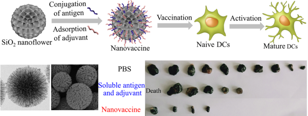 Here, we reported a cancer nanovaccine based on SiO2 nanoflowers with a special radial pore structure, which greatly enhanced cross-presentation and induced the production of cytotoxic T lymphocyte cells secreting granzymes B and interferon-γ. The antigen ovalbumin was covalently conjugated onto the as-synthesized hierarchical SiO2 nanoflowers, and the adjuvant cytosine-phosphate-guanine was electrostatically adsorbed into their radial pore by simple mixing before use. The nanovaccine exhibited excellent storage stability without antigen release after 27 days of incubation, negligible cytotoxicity to dendritic cells, and a high antigen loading capacity of 430 ± 66 mg·g−1 support. Besides, the nanovaccine could be internalized by dendritic cells via multiple pathways. And the enhancement of antigen/adjuvant uptake and lysosome escape of antigen were observed. Noteworthy, in vitro culture of bone marrow-derived dendritic cells in the presence of nanovaccine proved the activation of dendritic cells and antigen cross-presentation as well as secretion of proinflammatory cytokines. Besides, in vivo study verified the targeting of nanovaccine to draining lymph nodes, the complete suppression of tumor in six out of ten mice, and the triggering of notable tumor growth delay. Overall, the present results indicated that the nanovaccine can be served as a potential therapeutic vaccine to treat cancer.