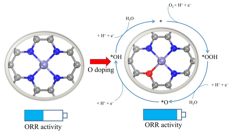 In this work, the detailed oxygen reduction reaction (ORR) catalytic performance of M-N4−xOx (M= Fe, Co, and Ni; x = 1–4) has been explored via the detailed density functional theory method. The results suggest that the formation energy of M-N4−xOx shows a good linear relationship with the number of doped O atoms. The adsorption manner of O2 on M-N4−xOx changed from end-on (x = 1 and 2) to side-on (x = 3 and 4), and the adsorption strength gradually increased. Based on the results for binding strength of ORR intermediates and the Gibbs free energy of ORR steps on the studied catalysts, we screened out two highly active ORR catalysts, namely Co-N3O1 and Ni-N2O2, which possess very small overpotentials of 0.27 and 0.32 V, respectively. Such activities are higher than the precious Pt catalyst. Electronic structure analysis reveals one of the reasons for the higher activity of Co-N3O1 and Ni-N2O2 is that they have small energy gaps and moderate highest occupied molecular orbital energy levels. Furthermore, the results of the density of states reveal that the O doping can improve the electronic structure of the original catalyst to tune the adsorption of the ORR intermediates.