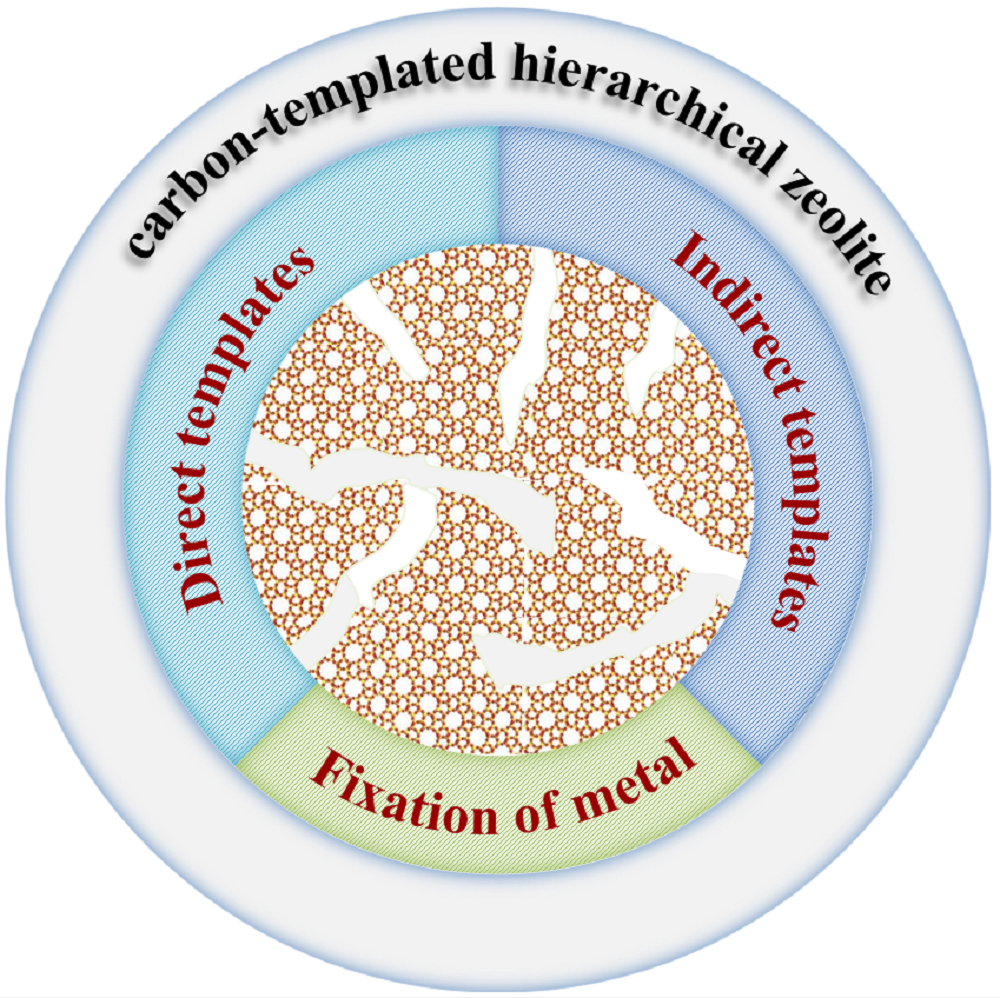 Hierarchically porous zeolites are promising candidates in catalytic conversion of relatively bulky molecules, and their syntheses have attracted significant attention. From both industrial and scientific perspectives, different carbon materials have been widely employed as hard templates for the preparation of hierarchically porous zeolites during the past two decades. In this review, the progress in synthetic strategies using carbon materials as templates is comprehensively summarized. Depending on the affinity between the carbon templates and zeolite precursors, the substantial strategies for synthesizing hierarchical zeolites are introduced in direct templates and indirect templates. Direct templates methods, by which the carbon materials are directly mixed with precursors gel as hard templates, are first reviewed. Then, we discuss the indirect templates method (crystallization of carbon-silica composites), by which the carbon is produced by in situ pyrolysis of organic-inorganic precursors. In addition, the technique of encapsulating metal species into zeolites crystals with the assistance of carbon templates is also discussed. In the conclusion part, the factors affecting the synthesis of carbon-templated hierarchically porous zeolites are remarked. This review is expected to attract interest in the synthesis strategies of hierarchically porous zeolites, especially cost-effective and large-scale production methodologies, which are essential to the industrial application of hierarchical zeolites.