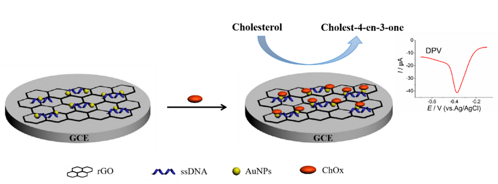 High density and uniform distribution of the gold nanoparticles functionalized single-stranded DNA modified reduced graphene oxide nanocomposites were obtained by non-covalent interaction. The positive gold nanoparticles prepared by phase inversion method exhibited good dimensional homogeneity and dispersibility, which could readily combine with single-stranded DNA modified reduced graphene oxide nanocomposites by electrostatic interactions. The modification of single-stranded DNA endowed the reduced graphene oxide with favorable biocompatibility and provided the preferable surface with negative charge for further assembling of gold nanoparticles to obtain gold nanoparticles/single-stranded DNA modified reduced graphene oxide nanocomposites with better conductivity, larger specific surface area, biocompatibility and electrocatalytic characteristics. The as-prepared nanocomposites were applied as substrates for the construction of cholesterol oxidase modified electrode and well realized the direct electron transfer between the enzyme and electrode. The modified gold nanoparticles could further catalyze the products of cholesterol oxidation catalyzed by cholesterol oxidase, which was beneficial to the enzyme-catalyzed reaction. The as-fabricated bioelectrode exhibited excellent electrocatalytic performance for the cholesterol with a linear range of 7.5−280.5 μmol·L−1, a low detection limit of 2.1 μmol·L−1, good stability and reproducibility. Moreover, the electrochemical biosensor showed good selectivity and acceptable accuracy for the detection of cholesterol in human serum samples.