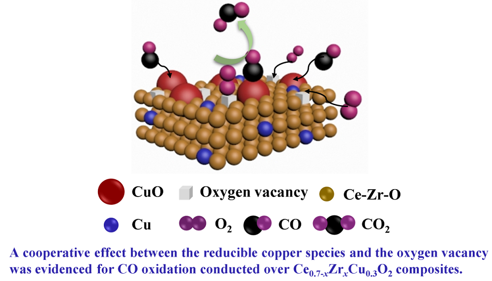 The effects of Zr doping on the existence of Cu and the catalytic performance of Ce0.7−xZrxCu0.3O2 for CO oxidation were investigated. The characterization results showed that all samples have a cubic structure, and a small amount of Zr doping facilitates Cu2+ ions entering the CeO2 lattice, but excessive Zr doping leads to the formation of surface CuO crystals again. Thus, the number of oxygen vacancies caused by the Cu2+ entering the lattice (e.g., Cu2+–□–Ce4+; □: oxygen vacancy), and the amount of reducible copper species caused by CuO crystals, varies with the Zr doping. Catalytic CO oxidation tests indicated that the oxygen vacancy and the reducible copper species were the adsorption and activation sites of O2 and CO, respectively, and the cooperative effects between them accounted for the high CO oxidation activity. Thus, the samples x = 0.1 and 0.3, which possessed the most oxygen vacancy or reducible copper species, showed the best activity for CO oxidation, with full CO conversion obtained at 110 °C. The catalyst is also stable and has good resistance to water during the reaction.