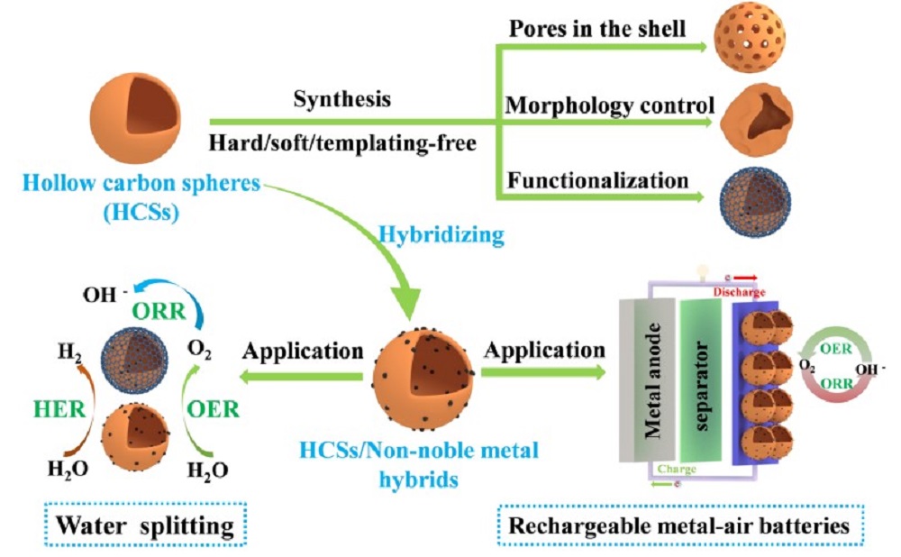 Hollow carbon spheres have garnered great interest owing to their high surface area, large surface-to-volume ratio and reduced transmission lengths. Herein, we overview hollow carbon sphere-based materials and their noble metal-free hybrids in catalysis. Firstly, we summarize the key fabrication techniques for various kinds of hollow carbon spheres, with a particular emphasis on controlling pore structure and surface morphology, and then heterogeneous doping as well as their metal-free/containing hybrids are presented; next, possible applications for non-noble metal/hollow carbon sphere hybrids in the area of energy-related catalysis, including oxygen reduction reaction, hydrogen evolution reaction, oxygen evolution reaction, water splitting, rechargeable Zn-air batteries and pollutant degradation are discussed; finally, we introduce the various challenges and opportunities offered by hollow carbon spheres from the perspective of synthesis and catalysis.