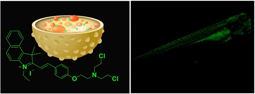 The design of three novel fatty nitrogen mustard-based anticancer agents with fluorophores incorporated into the alkene structure (CXL 118, CXL121, and CXL122) is described in this report. The results indicated that these compounds are selectively located in lysosomes and exhibit effective antitumour activity. Notably, these compounds can directly serve as both reporting and imaging agents in vitro and in vivo without the need to add other fluorescent tagging agents.