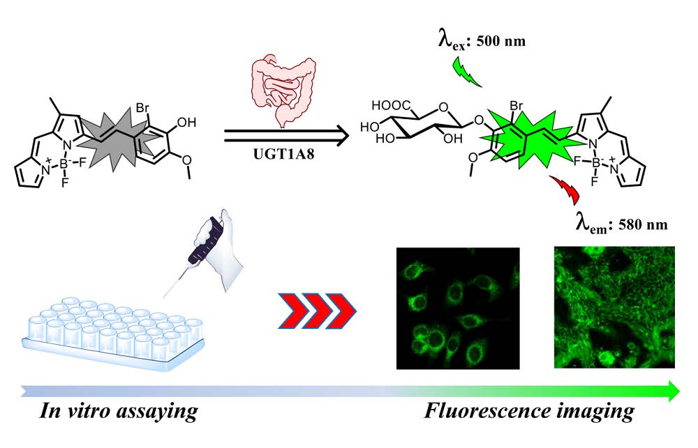 Uridine diphosphate (UDP)-glucuronosyltransferases (UGTs) are enzymes involved in the biotransformation of important endogenous compounds such as steroids, bile acids, and hormones as well as exogenous substances including drugs, environmental toxicants, and carcinogens. Here, a novel fluorescent probe BDMP was developed based on boron-dipyrromethene (BODIPY) with high sensitivity for the detection of UGT1A8. The glucuronidation of BDMP not only exhibited a red-emission wavelength (λex/λem = 500/580 nm), but also displayed an excellent UGT1A8-dependent fluorescence signal with a good linear relationship with UGT1A8 concentration. Based on this perfect biocompatibility and cell permeability, BDMP was successfully used to image endogenous UGT1A8 in human cancer cell lines (LoVo and HCT15) in real time. In addition, BDMP could also be used to visualize UGT1A8 in tumor tissues. These results suggested that BDMP is a promising molecular tool for the investigation of UGT1A8-mediated physiological function in humans.