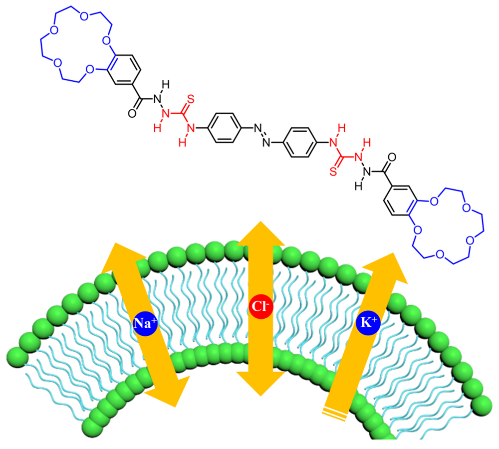 Na+, Cl‒ and K+ are the most abundant electrolytes present in biological fluids that are essential to the regulation of pH homeostasis, membrane potential and cell volume in living organisms. Herein, we report synthetic crown ether-thiourea conjugates as a cation/anion symporter, which can transport both Na+ and Cl− across lipid bilayers with relatively high transport activity. Surprisingly, the ion transport activities were diminished when high concentrations of K+ ions were present outside the vesicles. This unusual behavior resulted from the strong affinity of the transporters for K+ ions, which led to predominant partitioning of the transporters as the K+ complexes in the aqueous phase preventing the transporter incorporation into the membrane. Synthetic membrane transporters with Na+, Cl‒ and K+ transport capabilities may have potential biological and medicinal applications.
