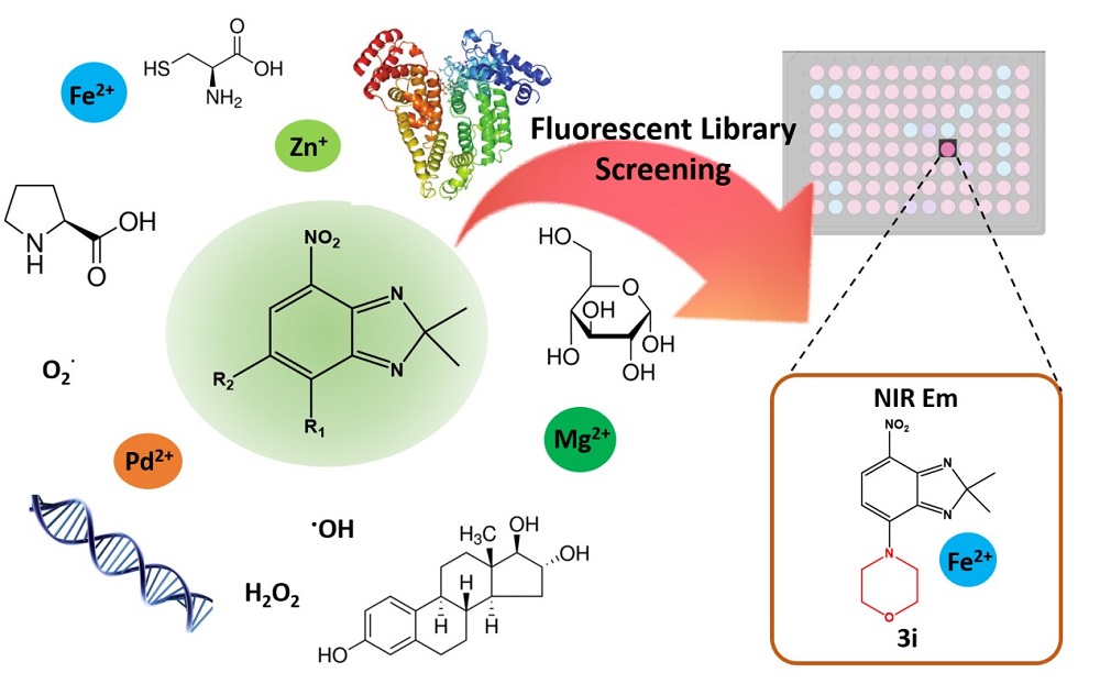 The development of fluorophores emitting in the near-infrared spectral window has gained increased attention given their suitable features for biological imaging. In this work, we have optimised a general and straightforward synthetic approach to prepare a small library of near-infrared-emitting C-bridged nitrobenzodiazoles using commercial precursors. C-bridged benzodiazoles have low molecular weight and neutral character as important features that are not common in most near-infrared dyes. We have investigated their fluorescence response in the presence of a wide array of 60 different biomolecules and identified compound 3i as a potential chemosensor to discriminate between Fe 2+ and Fe 3+ ions in aqueous media.