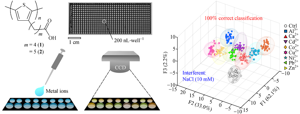 Chemosensor arrays have a great potential for on-site applications in real-world scenarios. However, to fabricate on chemosensor array a number of chemosensors are required to obtain various optical patterns for multi-analyte detection. Herein, we propose a minimized chemosensor array composed of only two types of carboxylate-functionalized polythiophene derivatives for the detection of eight types of metal ions. Upon recognition of the metal ions, the polythiophenes exhibited changes in their fluorescence intensity and various spectral shifts. Although both chemosensors have the same polymer backbone and recognition moiety, only the difference in the number of methylene groups contributed to the difference in the fluorescence response patterns. Consequently, the metal ions in aqueous media were successfully discriminated qualitatively and quantitatively by the chemosensor microarray on the glass chip. This study offers an approach for achieving a minimized chemosensor array just by changing the alkyl chain lengths without the necessity for many receptors and reporters.