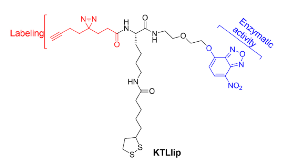 Lysine lipoylation plays vital roles in cell metabolism and redox processes. For example, removal of lipoylation will decrease pyruvate dehydrogenase activity and affect the citric acid cycle. Despite the important functions of lysine lipoylation, the mechanisms for the addition and removal of this modification remain largely unexplored. Very few useful chemical tools are available to study the interactions of lysine lipoylation with its regulatory delipoylation proteins. For example, immunoaffinity purification-mass spectrometry is one of such tools, which highly relies on antibody efficiency and purification techniques. Single-step activity based fluorogenic probes developed by our groups and others is also an efficient method to study the deacylation activity. Affinity-based labeling probe using photo-cross-linker is a powerful platform to study the transient and dynamic interactions of peptide ligands with the interacting proteins. Herein, we have designed and synthesized a dual-function probe KTLlip for studying enzymatic delipoylation (eraser) activity and interaction of lysine lipoylation with the eraser at the same time. We show that KTLlip can be used as a useful tool to detect delipoylation as demonstrated by its ability to fluorescently label the eraser activity of recombinant Sirt2. We envision that the probe will help delineate the roles of delipoylation enzyme in biology.