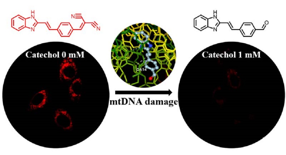 Mitochondrial DNA has a special structure that is prone to damage resulting in many serious diseases, such as genetic diseases and cancers. Therefore, the rapid and specific monitoring of mitochondrial DNA damage is urgently needed for biological recognition. Herein, we constructed an in situ hydrophobic environment-triggering reactive fluorescence probe named MBI-CN. The fluorophore was 2-styrene-1H-benzo[d]imidazole, and malononitrile was introduced as a core into a molecule to initiate the hydrolysis reaction in the specific environment containing damaged mitochondrial DNA. In this design, MBI-CN conjugates to mitochondrial DNA without causing additional damages. Thus, MBI-CN can be hydrolyzed to generate MBI-CHO in an in situ hydrophobic environment with mitochondrial DNA damage. Meanwhile, MBI-CHO immediately emitted a significative fluorescence signal changes at 437 and 553 nm within 25 s for the damaged mitochondria DNA. Give that the specific and rapid response of MBI-CN does not cause additional damages to mitochondrial DNA, it is a potentially effective detection tool for the real-time monitoring of mitochondrial DNA damage during cell apoptosis and initial assessment of cell apoptosis.