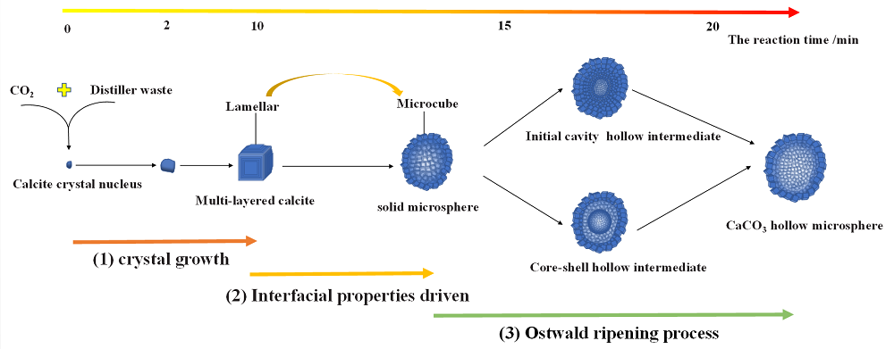For decades, distiller waste and CO2 were not the first choice for production of high valued products. Here, CaCO3 hollow microspheres, a high-value product was synthesized from such a reaction system. The synthetic methods, the formation mechanism and operational cost were discussed. When 2.5 L·min–1·L–1 CO2 was flowed into distiller waste (pH = 11.4), spheres with 4–13 μm diameters and about 2 μm shell thickness were obtained. It is found that there is a transformation of CaCO3 particles from solid-cubic nuclei to hollow spheres. Firstly, the Ca(OH)2 in the distiller waste stimulated the nucleation of calcite with a non-template effect and further maintained the calcite form and prevented the formation of vaterite. Therefore, in absence of auxiliaries, the formation of hollow structures mainly depended on the growth and aging of CaCO3. Studies on the crystal morphology and its changes during the growth process point to the inside–out Ostwald effect in the formation of hollow spheres. Change in chemical properties of the bulk solution caused changes in interfacial tension and interfacial energy, which promoted the morphological transformation of CaCO3 particles from cubic calcite to spherical clusters. Finally, the flow process for absorption of CO2 by distiller waste was designed and found profitable.