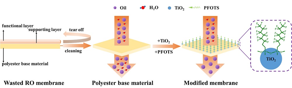 The increasing applications of seawater desalination technology have led to the wide usage of polyamide reverse osmosis membranes, resulting in a large number of wasted reverse osmosis membranes. In this work, the base nonwoven layer of the wasted reverse osmosis membrane was successfully modified into the hydrophobic membrane via surface deposition strategy including TiO2 and 1H,1H,2H,2H-perfluorooctyltrichlorosilane (PFOTS), respectively. Various techniques were applied to characterize the obtained membranes, which were then used to separate the oil–water system. The optimally modified membrane displayed good hydrophobicity with a contact angle of 135.2° ± 0.3°, and its oil–water separation performance was as high as 97.8%. After 20 recycle tests, the oil–water separation performance remained more than 96%, which was attributed to the film adhesion of the anchored TiO2 and PFOTS layer on the surface. This work might provide a new avenue for recycling the wasted reverse osmosis membrane used in oily wastewater purification.