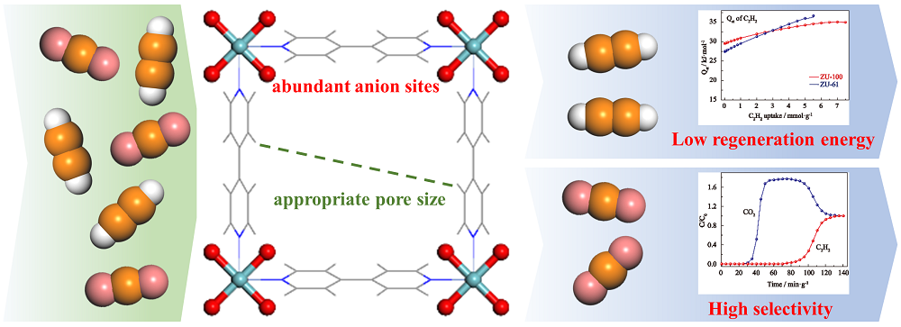 Adsorptive separation of acetylene/carbon dioxide mixtures by porous materials is an important and challenging task due to their similar sizes and physical properties. Here, remarkable acetylene/carbon dioxide separation featuring a high dynamic breakthrough capacity for acetylene (4.3 mmol·g–1) as well as an ultralow acetylene regeneration energy (29.5 kJ·mol–1) was achieved with the novel TiF62–-pillared material ZU-100 (TIFSIX-bpy-Ni). Construction of a pore structure with abundant TiF62– anion sites and pores with appropriate sizes enabled formation of acetylene clusters through hydrogen bonds and intermolecular interactions, which afforded a high acetylene capacity (8.3 mmol·g–1) and high acetylene/carbon dioxide uptake ratio (1.9) at 298 K and 1 bar. Moreover, the NbO52– anion-pillared material ZU-61 investigated for separation of acetylene/carbon dioxide. In addition, breakthrough experiments were also conducted to further confirm the excellent dynamic acetylene/carbon dioxide separation performance of ZU-100.
