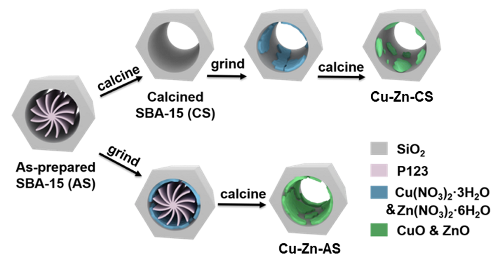 The number of active components and their dispersion degree are two key factors affecting the performance of adsorbents. Here, we report a simple but efficient strategy for dispersing active components by using a confined space, which is formed by mesoporous silica walls and templates in the as-prepared SBA-15 (AS). Such a confined space does not exist in the conventional support, calcined SBA-15, which does not contain a template. The Cu and Zn precursors were introduced to the confined space in the AS and were converted to CuO and ZnO during calcination, during which the template was also removed. The results show that up to 5 mmol·g–1 of CuO and ZnO can be well dispersed; however, severe aggregation of both oxides takes place in the sample derived from the calcined SBA-15 with the same loading. Confined space in the AS and the strong interactions caused by the abundant hydroxyl groups are responsible for the dispersion of CuO and ZnO. The bimetallic materials were employed for the adsorptive separation of propene and propane. The samples prepared from the as-prepared SBA-15 showed superior performance to their counterparts from the calcined SBA-15 in terms of both adsorption capacity of propene and selectivity for propene/propane.