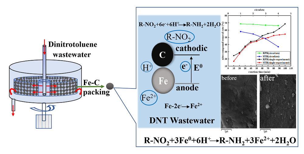 The application of iron–carbon (Fe–C) micro-electrolysis to wastewater treatment is limited by the passivation potential of the Fe–C packing. In order to address this problem, high-gravity intensified Fe–C micro-electrolysis was proposed in this study for degradation of dinitrotoluene wastewater in a rotating packed bed (RPB) using commercial Fe–C particles as the packing. The effects of reaction time, high-gravity factor, liquid flow rate and initial solution pH were investigated. The degradation intermediates were determined by gas chromatography-mass spectrometry, and the possible degradation pathways of nitro compounds by Fe–C micro-electrolysis in RPB were also proposed. It is found that under optimal conditions, the removal rate of nitro compounds reaches 68.4% at 100 min. The removal rate is maintained at approximately 68% after 4 cycles in RPB, but it is decreased substantially from 57.9% to 36.8% in a stirred tank reactor. This is because RPB can increase the specific surface area and the renewal of the liquid–solid interface, and as a result the degradation efficiency of Fe–C micro-electrolysis is improved and the active sites on the Fe–C surface can be regenerated for continuous use. In conclusion, high-gravity intensified Fe–C micro-electrolysis can weaken the passivation of Fe–C particles and extend their service life.
