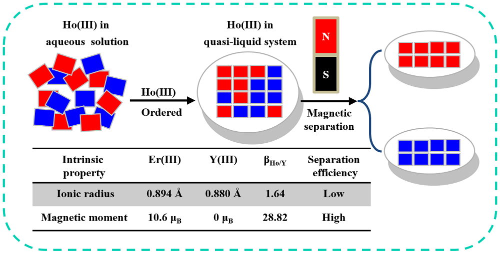 The separation of rare earth elements is particularly difficult due to their similar physicochemical properties. Based on the tiny differences of ionic radius, solvent extraction has been developed as the “mass method” in industry with hundreds of stages, extremely intensive chemical consumption and large capital investments. The differences of the ionic magnetic moment among rare earths are greater than that of ionic radius. Herein, a novel method based on the large ionic magnetic moment differences of rare earth elements was proposed to promote the separation efficiency. Rare earths were firstly dissolved in the ionic liquid, then the ordering degree of them was improved with the Z-bond effect, and finally the magnetic moment differences between paramagnetic and diamagnetic rare earths in quasi-liquid system were enhanced. Taking the separation of Er/Y, Ho/Y and Er/Ho as examples, the results showed that Er(III) and Ho(III) containing ionic liquids had obvious magnetic response, while ionic liquids containing Y(III) had no response. The separation factors of Er/Y and Ho/Y were achieved at 9.0 and 28.82, respectively. Magnetic separation via quasi-liquid system strategy provides a possibility of the novel, green, and efficient method for rare earth separation.