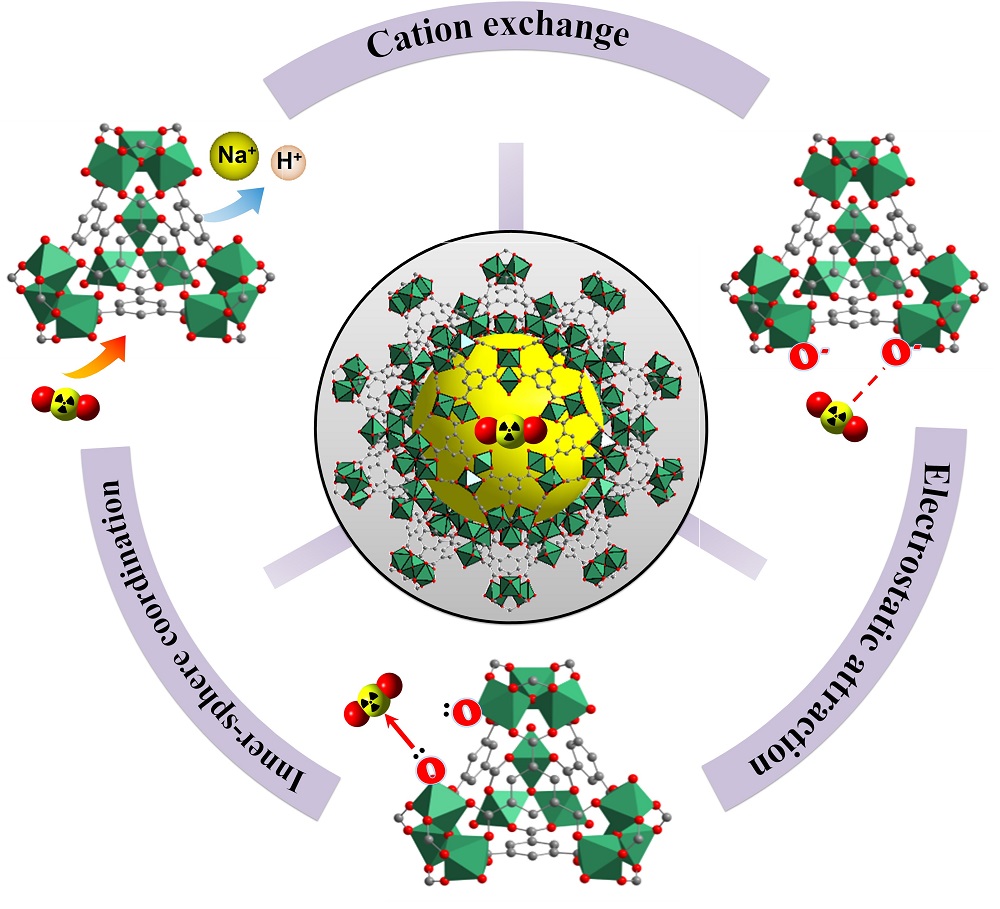 Although metal–organic frameworks offer a new platform for developing versatile sorption materials, yet coordinating the functionality, structure and component of these materials remains a great challenge. It depends on a comprehensive knowledge of a “real sorption mechanism”. Herein, a ternary mechanism for U(VI) uptake in metal–organic frameworks was reported. Analogous MIL-100s (Al, Fe, Cr) were prepared and studied for their ability to sequestrate U(VI) from aqueous solutions. As a result, MIL-100(Al) performed the best among the tested materials, and MIL-100(Cr) performed the worst. The nuclear magnetic resonance technique combined with energy-dispersive X-ray spectroscopy and zeta potential measurement reveal that U(VI) uptake in the three metal–organic frameworks involves different mechanisms. Specifically, hydrated uranyl ions form outer-sphere complexes in the surface of MIL-100s (Al, Fe) by exchanging with hydrogen ions of terminal hydroxyl groups (Al-OH2, Fe-OH2), and/or, hydrated uranyl ions are bound directly to Al(III) center in MIL-100(Al) through a strong inner-sphere coordination. For MIL-100(Cr), however, the U(VI) uptake is attributed to electrostatic attraction. Besides, the sorption mechanism is also pH and ionic strength dependent. The present study suggests that changing metal center of metal–organic frameworks and sorption conditions alters sorption mechanism, which helps to construct effective metal–organic frameworks-based sorbents for water purification.