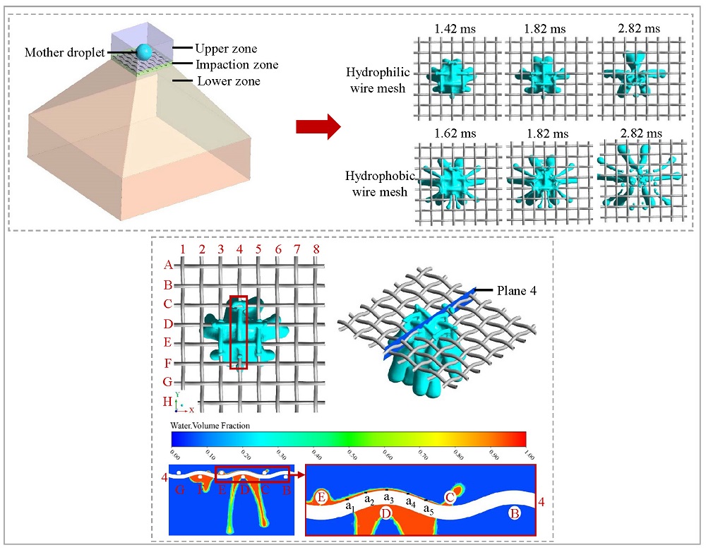 Droplet impacting on the stainless steel wire mesh is very common in chemical devices, like a rotating packed bed. Surface wettability of wire mesh significantly affects the liquid flow pattern and liquid dispersion performance. However, the effect of surface wettability on the impaction phenomena at microscale such as liquid film is still unknown. In this work, the dynamic behavior of liquid film on the surface of wire mesh was analyzed by computational fluid dynamics simulation. The dynamic behavior of liquid film on the surface of wire mesh can be divided into the following three steps: (1) spreading step; (2) shrinkage process; (3) stabilizing or disappearing step. Effects of surface wettability, as well as operating conditions, on wetting area and liquid film thickness were studied. Compared to the hydrophilic wire mesh, the final wetting area of hydrophobic wire mesh is zero in most cases. The average liquid film thickness on the surface of hydrophilic wire mesh is 30.02–77.29 μm, and that of hydrophobic wire mesh is 41.76–237.37 μm. This work provided a basic understanding of liquid film flow at microscale on the surface with various surface wettabilities, which can be guiding the packing optimization and design.