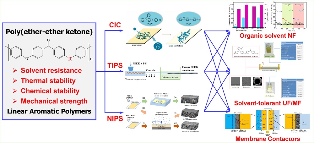 Poly(ether−ether ketone) (PEEK) is a linear aromatic macromolecule, which can form semi-crystalline aggregative status, allowing PEEK materials to have strong environment tolerance and excellent physicochemical properties. PEEK materials have become a promising alternative to fabricate particular membranes used in extreme conditions. In the past few decades, many researches and evolutions have emerged in membrane fabrication with PEEK materials and its applications for treating organic solvents and their mixtures; however, there are little systematic and comprehensive literature to summarize fabrication approaches, compile applications, and elaborate PEEK property-structure relationship. In this review, the main approaches to fabricate PEEK-based membranes are illustrated concretely, including conventional thermal-induced and non-solvent-induced phase separation, and novel chemical-induced crystallization; the representative applications in ultrafiltration, nanofiltration and membrane contactor containing organic solvents are demonstrated systematically. Meanwhile, the mechanism to tune PEEK solubility in solvents, which can be achieved by altering monomers in synthesis processes or changing membrane preparation routes, is deeply analyzed. Moreover, the existing problems and the future prospects are also discussed. This review provides positive guidance for designing and fabricating membranes using PEEK and its derivative materials for task-specific applications in harsh conditions.